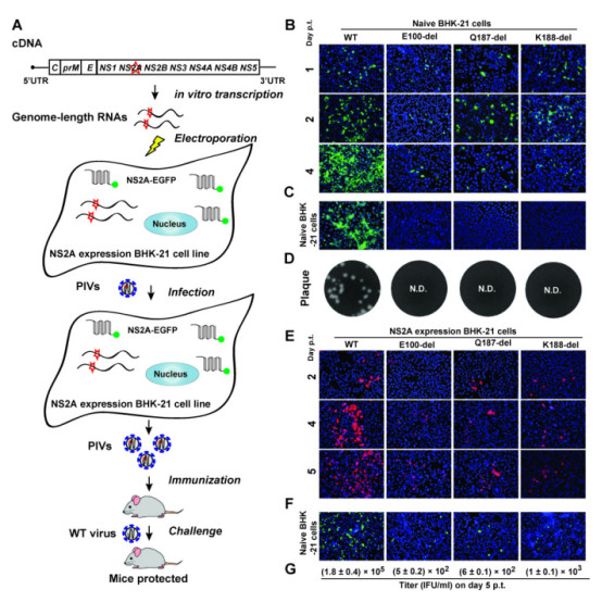 研究人員已改造后的DENV毒株為新疫苗開發(fā)平臺(tái),通過使用反向互補(bǔ)補(bǔ)充方法,將DENV野毒株的非結(jié)構(gòu)蛋白2A(NS2A)整合進(jìn)候選疫苗株內(nèi),拯救出弱感染力的DENV毒株-PIV?NS2A。對PIV?NS2A進(jìn)行培養(yǎng)發(fā)現(xiàn),其細(xì)胞感染率能達(dá)到107?IFU/ml,通過免疫小鼠發(fā)現(xiàn),PIV?NS2A能夠刺激機(jī)體T細(xì)胞免疫反應(yīng)及產(chǎn)生高效價(jià)的中和抗體,抵抗DENV野毒株的感染。