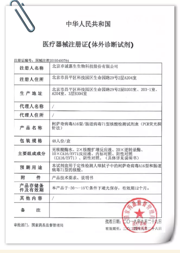 ?北京卓誠惠生生物科技股份有限公司研發(fā)的柯薩奇病毒A16型/腸道病毒71型核酸檢測試劑盒(PCR熒光探針法)正式獲得醫(yī)療器械注冊證,隆重上市!