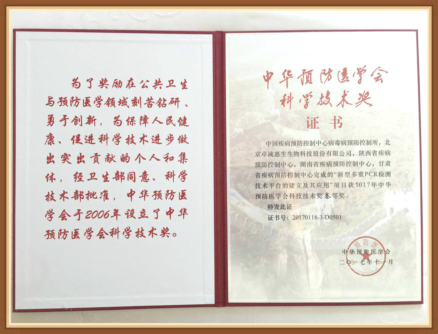 為表彰在2017年推動(dòng)科學(xué)技術(shù)進(jìn)步,對首都經(jīng)濟(jì)建設(shè)和社會(huì)發(fā)展作出貢獻(xiàn)的集體和個(gè)人,北京市人民政府于2017年11月為北京卓誠惠生參與完成的“新型多重PCR檢測技術(shù)平臺(tái)的建立及其應(yīng)用”項(xiàng)目頒發(fā)北京市科學(xué)技術(shù)獎(jiǎng)叁等獎(jiǎng),以資鼓勵(lì)。