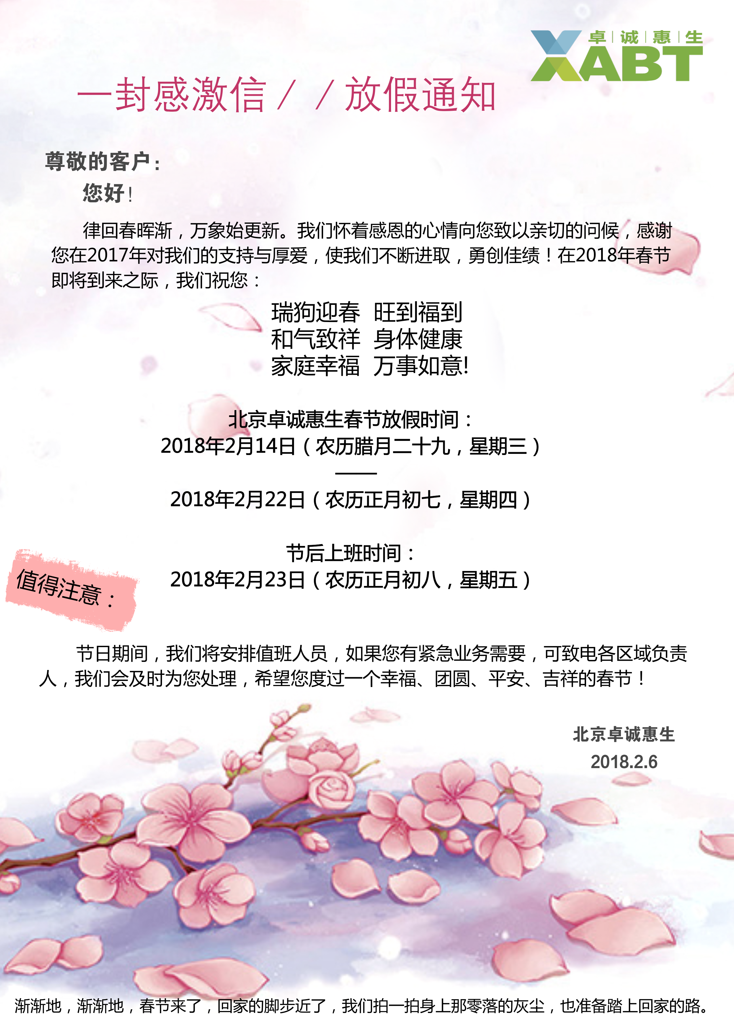 北京卓誠惠生春節(jié)放假時(shí)間:2018年2月14日至2018年2月22日,節(jié)后上班時(shí)間:2018年2月23日